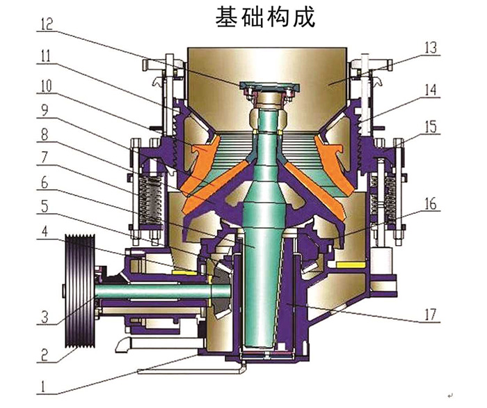 1.機(jī)架 2.大帶輪 3.傳動(dòng)軸 4.小錐齒輪 5.大錐齒輪 6.主軸 7.彈簧結(jié)構(gòu) 8.軀體 9.破碎壁 10.軋臼壁 11.調(diào)整套 12.分料盤(pán) 13.進(jìn)料斗 14.調(diào)整環(huán) 15.支撐套 16.碗型軸架部 17.偏心套